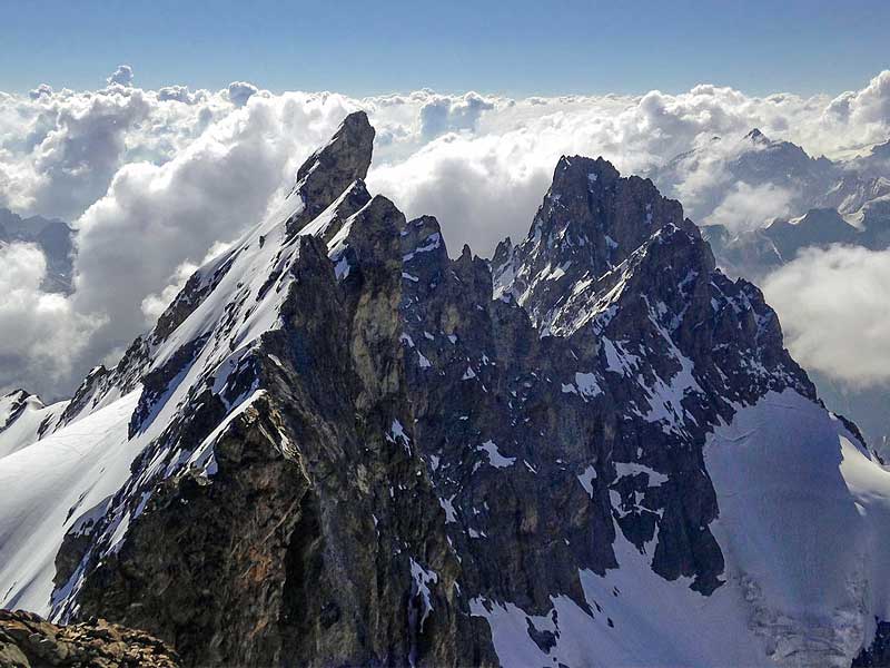 zur zeit allerbeste verhältnisse - der ganze grat ist trocken und schneefrei. die nordseitige umgehung des pic zigmondy ist blank, wird aber durch das angebrachte stahlseil sehr entschärft.