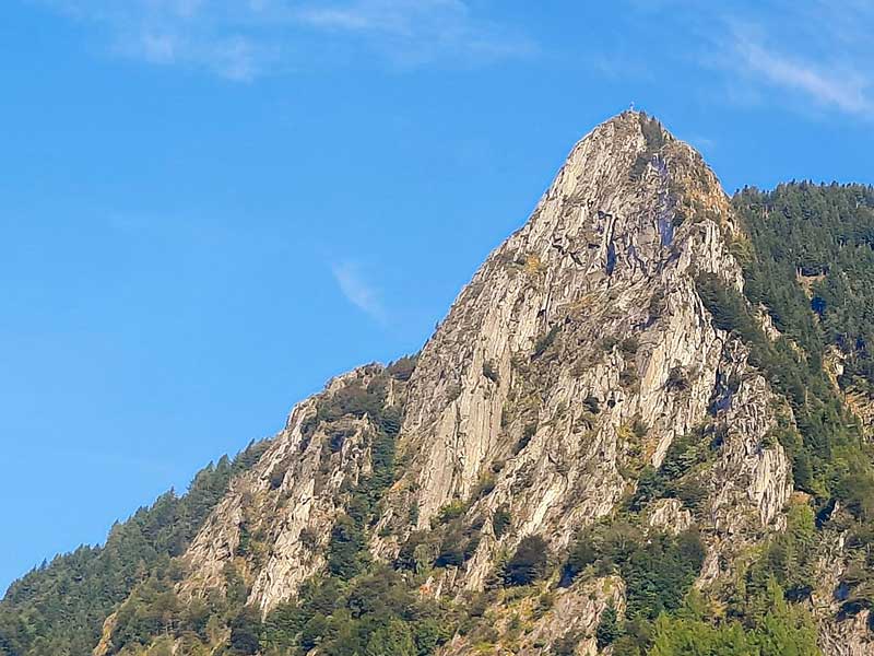 die erste, sehr moosige platte sieht äusserst unattraktiv aus. daher umgingen wir sie in besagter rinne und stiegen nach rechts zum ersten standplatz bei einem baum hoch. hier beginnt die kletterei, wobei sich kurze, knackige felsabschnitte mit vielen gras- und erdpassagen abwechseln. die bohrhaken sind nicht gerade üppig gestreut, und vor allem bei den ausstiegen aus den steilen platten folgt jedesmal griffloser dreck. früher wuchsen hier wohl genügend wacholderbüsche, sodass man sich daran einigermassen sicher auf die erde hochziehen konnte, doch heute sind die meisten dieser büsche abgestorben. das tote holz wirkt nicht allzu zuverlässig. so erreicht man nach drei seillängen einen kleinen turm, von dem man wenige meter nach hinten absteigt. der obere teil bietet dann zum glück schönere kletterei, besseren fels und auch etwas engere absicherung. bei der letzten länge sind zwei A0-stellen eingezeichnet, wobei die erste (gleich nach dem stand) etwa drei meter links in einem schönen riss umgangen werden kann (allerdings ist dann der zweite bohrhaken total am falschen ort). für die zweite A0-stelle auf der steilen platte fanden wir keine freie lösung. so erreicht man bald den gipfel. (3¼h)