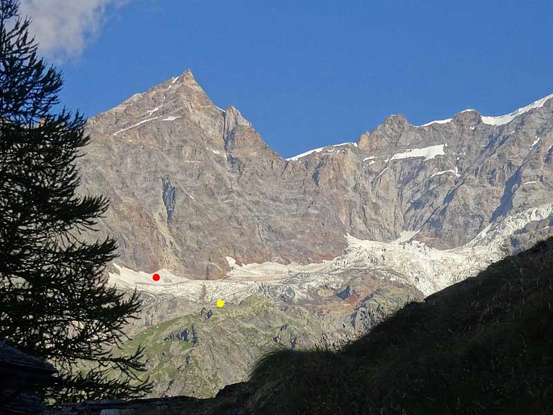 daher besser gleich am ersten tag noch weiter via alpe fun d'ekku (fondecco) und nun auf schlechtem weg nordwärts bis zum gletscherbach, der von der punta vittoria her kommt. auf dem nördlichen ufer dieses baches steil westwärts empor bis ungefähr zur 2500er-höhenkurve, wo man nordwärts richtung ghiacciaio delle piode-occidentale abdrehen kann. auf circa 2600m finden sich auf dem gletschervorfeld ein paar mehr oder weniger bequeme biwakplätze, von wo aus man auch den weiteren routenverlauf einigermassen einsehen kann.
