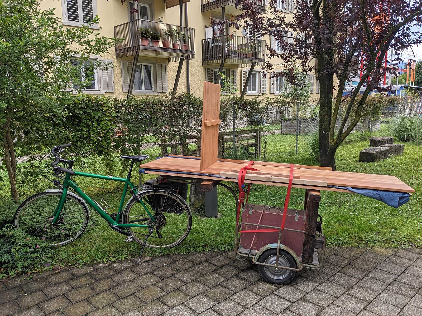 Es ist mir wichtig, mit einheimischen Hölzern zu arbeiten. Diese beziehe ich grösstenteils von zwei nahegelegenen Sägereien, die ihre Bäume so weit wie möglich aus der Innerschweiz beziehen. Für die Holzveredelung verwende ich ausschliesslich natürliche Produkte. Und um einen kleinen Beitrag gegen den überbordenden Autoverkehr zu leisten, liefere ich in der Agglomeration Luzern alles, was möglich ist, per Veloanhänger aus.