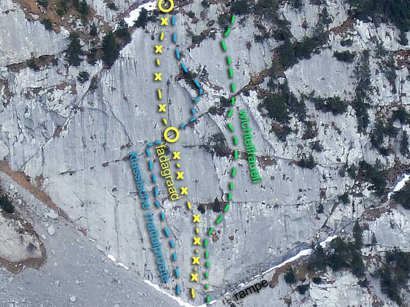 | einstieg: | circa 50 m links des auffälligen risskamins und circa 20 m rechts der alten ost-wand-route 833 (bächli) | beim auffälligen risskamin unterhalb des nordgipfels |