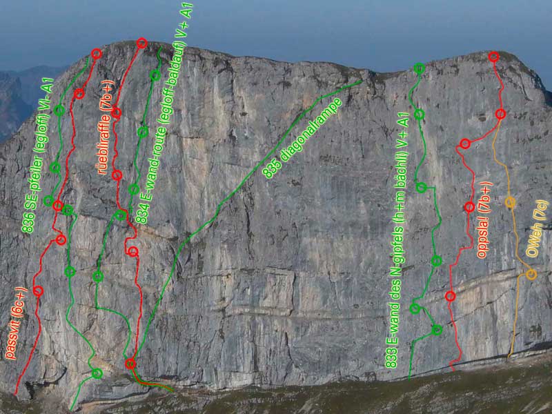 | abseilen: | via abseilpiste der route 833 nahe des nordgipfels die routen "passvit", "oppsla!" und "OWeh" sind wegen der quergänge und "rüebli-raffle" wegen der steilheit nicht zum abseilen geeignet | |