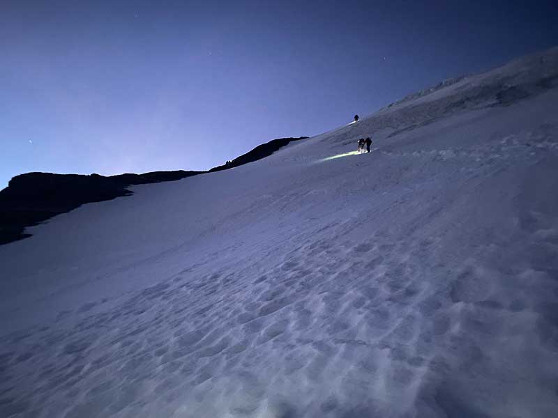 material: 30m-seil, schlingen, 1 express, je nach firnverhältnissen eisschrauben
