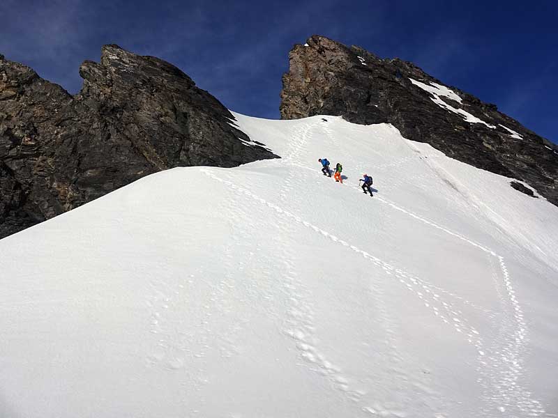 nun geht es bei guter firnlage einfach über die NW-flanke und den NNW-grat auf das morgenhorn (3620m). (ab mitte sommer ist diese flanke meistens blank - so würde man zeit mit schrauben-setzen verlieren.) 1h
