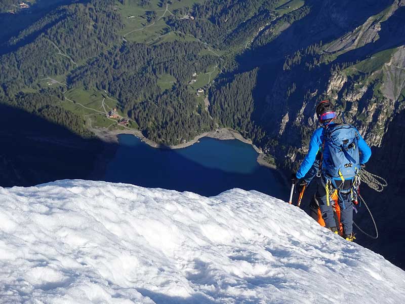 blüemlisalp überschreitung E-W: eindrücklicher abstieg über den firngrat, unten lacht der oeschinensee