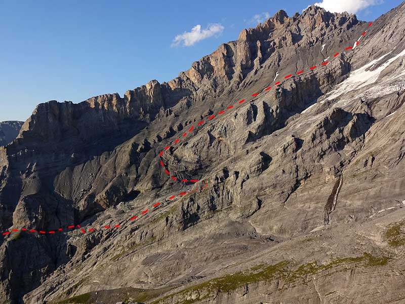 abenteuerlicher ist der abstieg nach westen zur fründenschnuer, wobei hier allerdings ein sehr gutes orientierungsvermögen erforderlich ist: zunächst auf dem geröllband weit nach WNW ausholend bis eine moränenartige rippe den abstieg zum gletschervorfeld des oberen oeschinengletschers erlaubt (hie und da steinmänner und gelegentliche wegspuren). südlich haltend und einen bach traversierend erreicht man so das flache gelände unterhalb des gletschers. nun nochmals richtung WNW durch eine rinne auf die untere geröllebene absteigen und von hier circa 30m auf das gut sichtbare, ausgesetzte band unterhalb der überhängenden felsen hochklettern. auf dem sattel zeigt ein steinmann den weg. nun auf ausgesetzem weg zu den schönen blumenwiesen des läster und der winteregg. hier führt ein weglein nach dem letzten felsband zum unterbärgli (1824m). T5