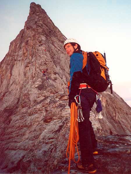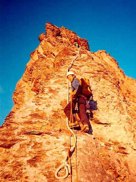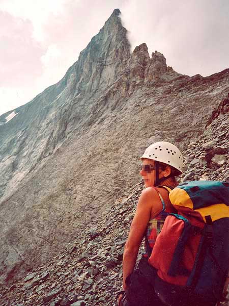 mittellegigrat (eiger) mit aufstieg über's challi: auf der rippe im underen challiband, hinten der mönch sowie kaum sichtbar die berglihütte