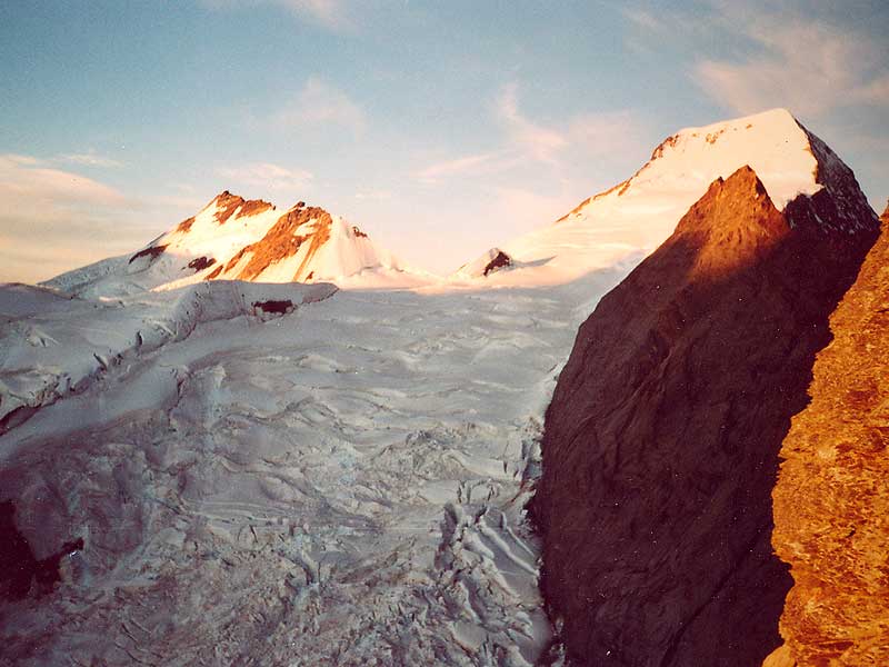 mittellegigrat (eiger) mit aufstieg über's challi: morgensonne auf trugberg und mönch