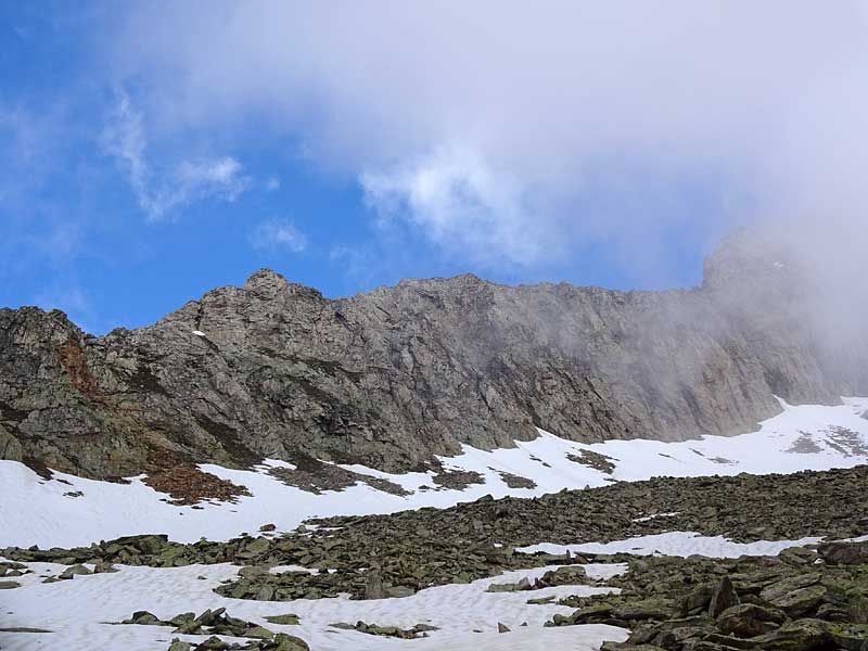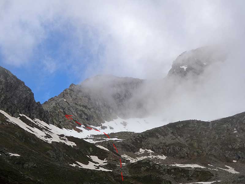 grisighorn südgrat: die einstiegsscharte erreicht man oberhalb des braunen felsausbruchs