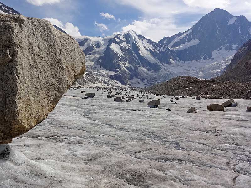 vom grimsel-hospiz über die staumauer und nun auf sehr attraktivem weg dem grimselsee entlang, vorbei am eldorado (bärenritzflue) auf den langgezogenen unteraargletscher. als übernachtungsgelegenheit bietet sich die wunderschöne lauteraarhütte (2392m) oder aber das etwa zwei wegstunden weiter westlich liegende aarbiwak (2733m) an. die endlose gletscherwanderung lässt beinahe baltoro-feeling aufkommen! L, 5h