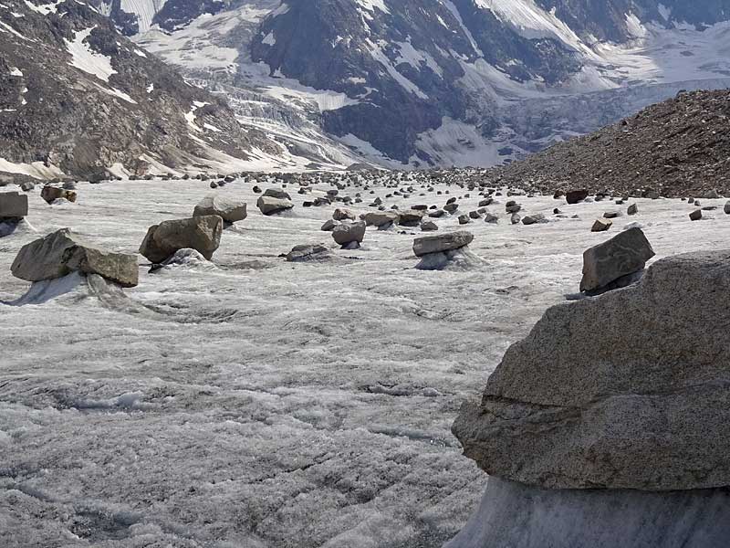 finsteraargletscher (auf dem weg zum aarbiwak): ein gletschertischgarten auf dem finsteraargletscher, hinten rechts das finsteraarhorn