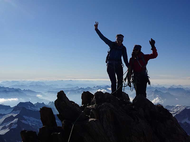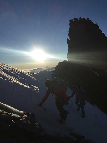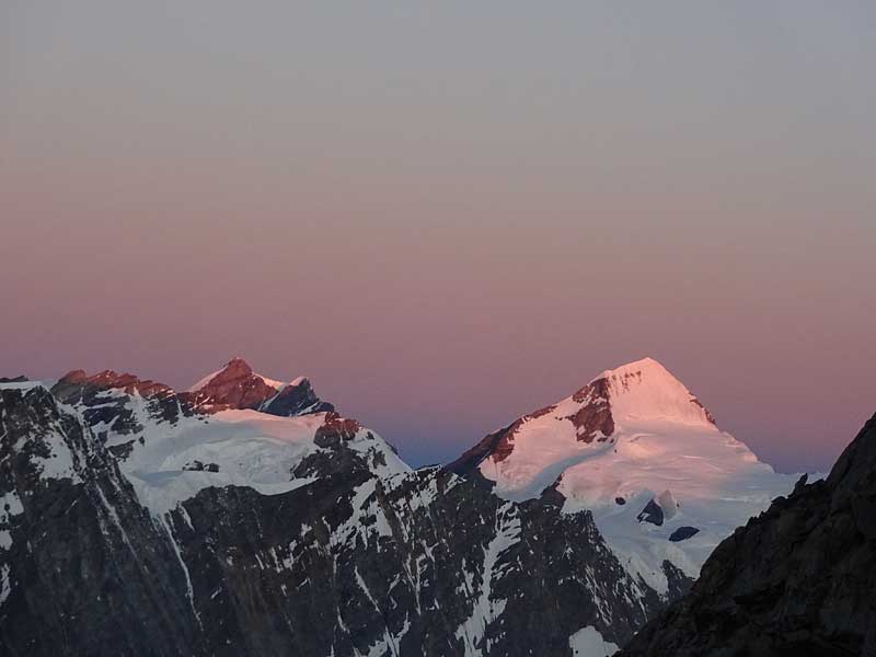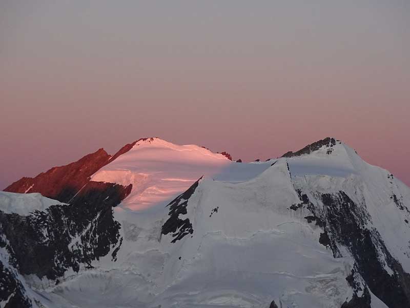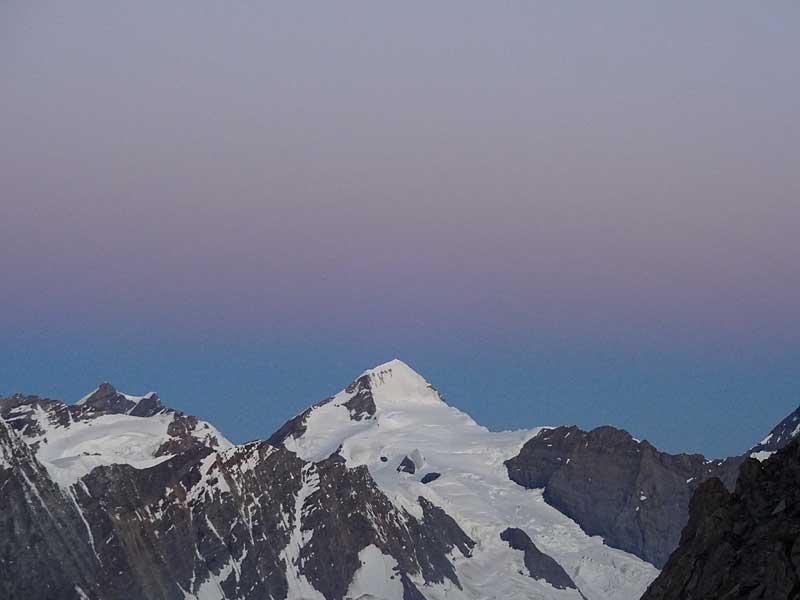 lauteraarhorn (SSW-couloir und SE-grat, abstieg schraubengang): das hinter fiescherhorn wird bereits von der sonne beleuchtet