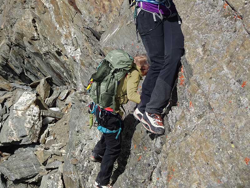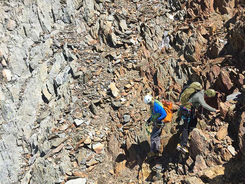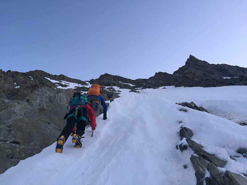 falls im couloir noch schnee liegt, kann man problemlos durch dieses zur firnflanke hochsteigen. ansonsten klettert man links des baches (von unten gesehen) die felsen hoch und erreicht so das schneefeld. über dieses zum sattel westlich von pt.3918 hoch und nun über den schönen klettergrat mit bestem fels auf den gipfel. ZS, 5,5h