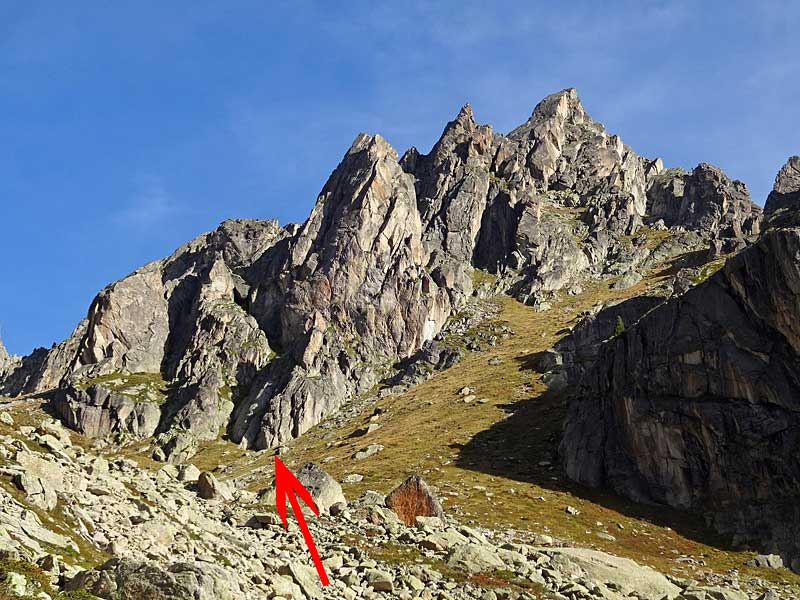 six carro SSW-grat: an diesem roten türmchen erfolgt die erste crux