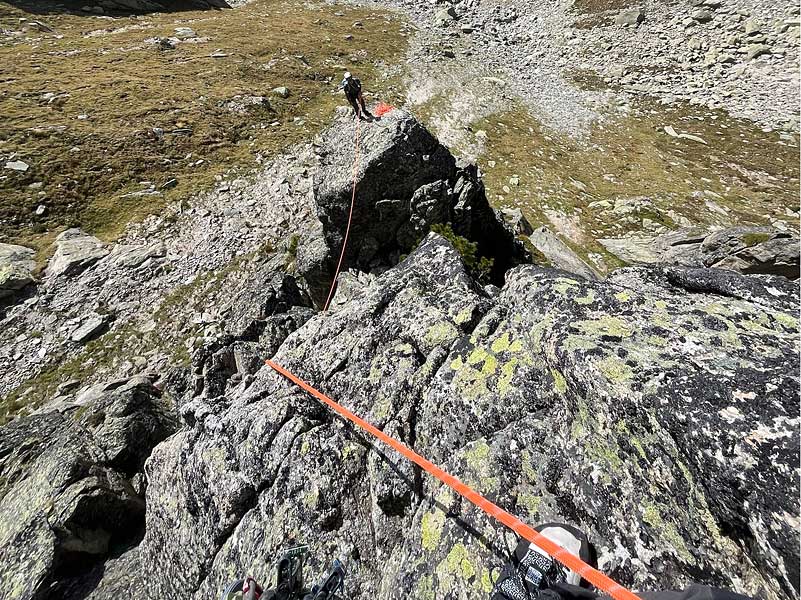 zunächst einmal richtung NW, dann einmal richtung W je 25m abseilen, um so die rinne westlich des six carro zu erreichen. nun entlang von wegspuren und steinmännern zurück zum einstieg.
