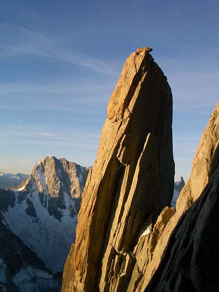 arête jardin (aiguille verte): schöne granittürme entlang des aufstiegs mit dem berühmten nachbarn im hintergrund