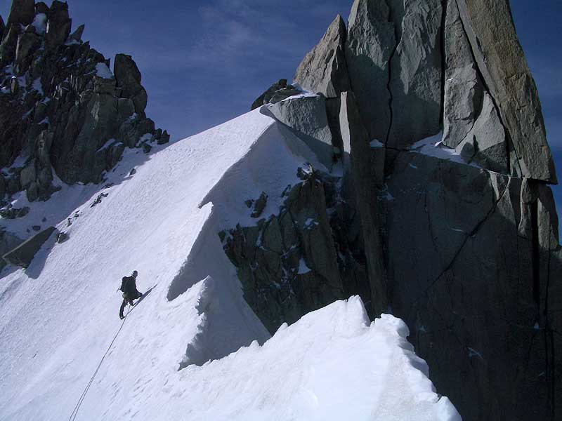 gute verhältnisse am jardin-grat, der bergschrund unter dem col de l'aiguille verte ist zur zeit noch problemlos passierbar. der firngrat zwischen aiguille du jardin und grande rocheuse sowie der steile firngrat im aufstieg zur aiguille verte sind bereits recht hart, doch noch einigermassen sicher passierbar.
