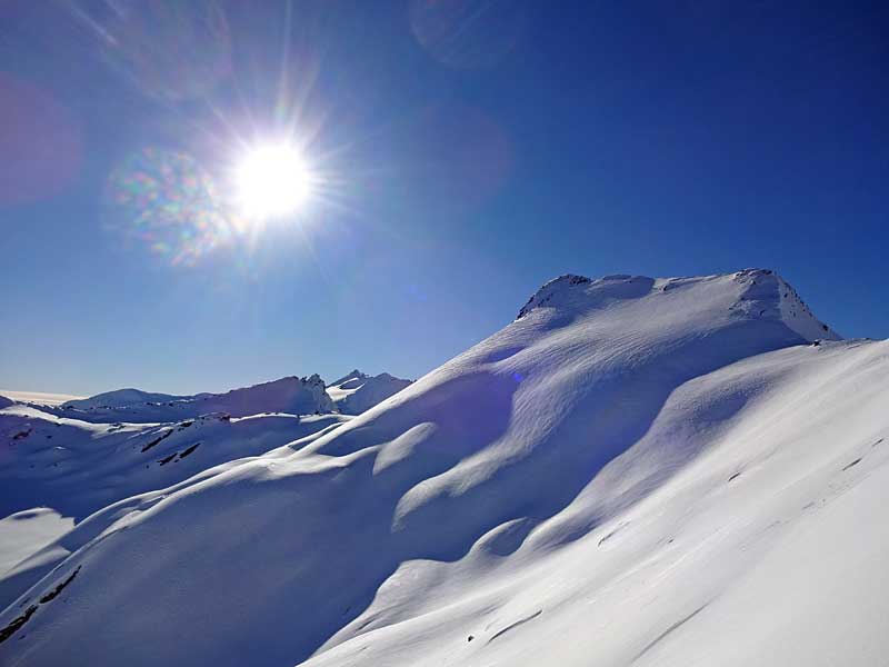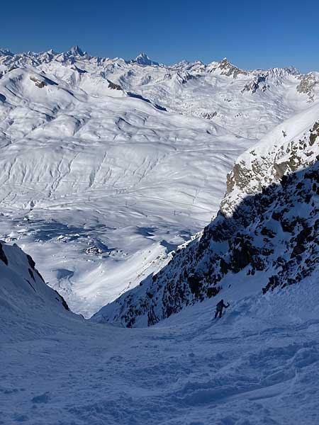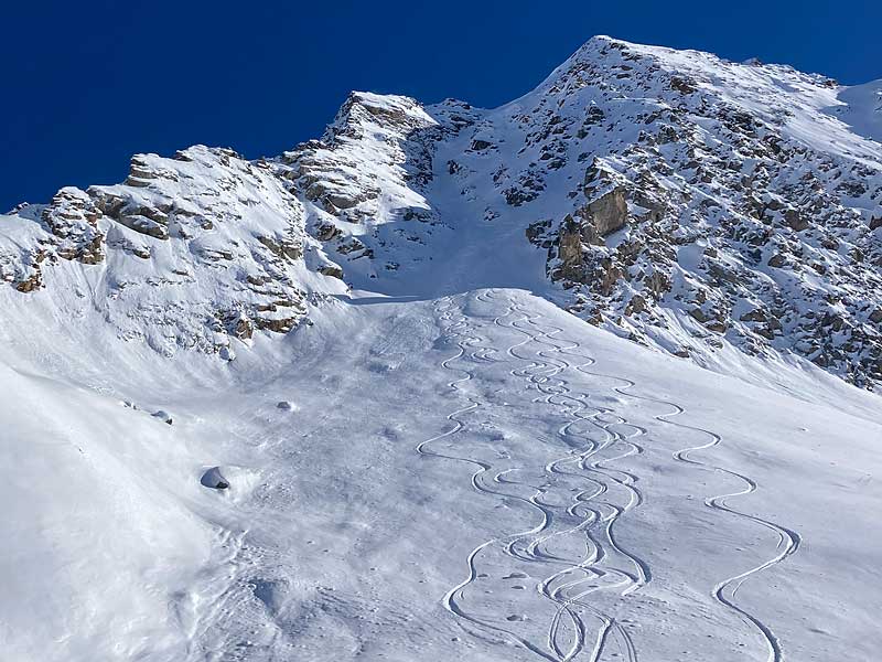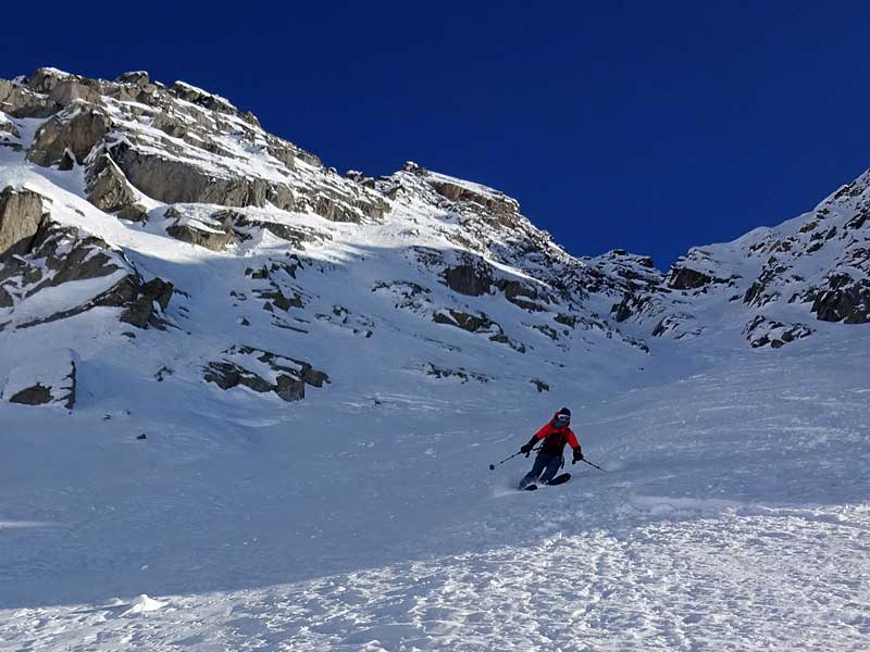 im grossen ganzen liegt im ganzen bedrettotal fantastischer pulverschnee - nur haben leider die steilsten partien des couloirs etwas wind abbekommen und sind daher mit einem unangenehmen deckel bespickt. alle hänge unter ~35° warten aber mit bestem pulver auf.