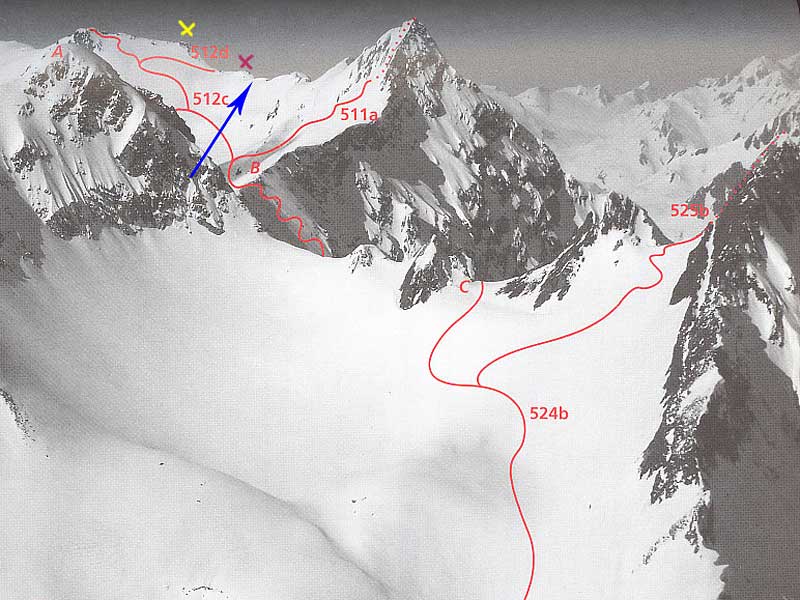 marchhorn: falscher SAC-führer: 512d ist einfahrt WNW-couloir, blauer pfeil zeigt auf canalone-start, gelb pt.2961, rot pt.2883