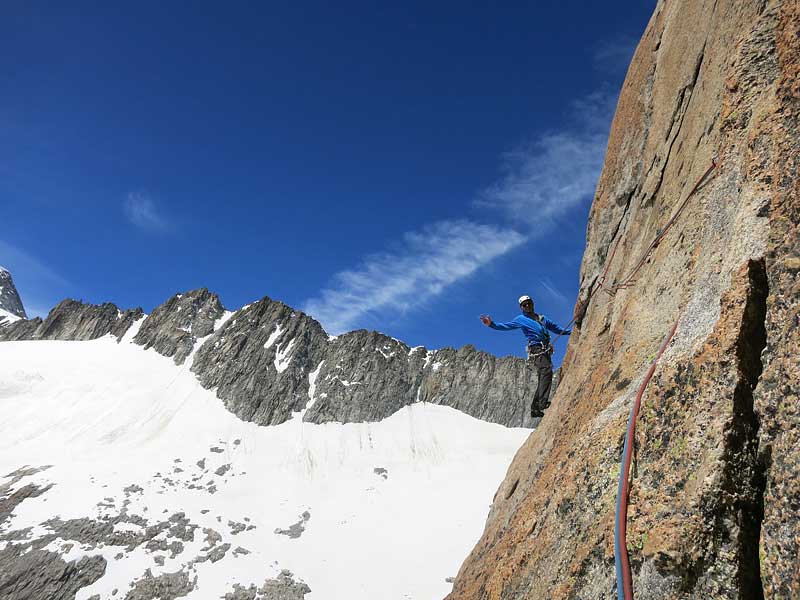 der aufstieg zum tiefengletscher lässt sich gerade noch auf letzten schneeresten bewältigen, doch in wenigen tagen geht man besser über den vorbau des gletschhorns. die wand selber natürlich in bestem zustand.
