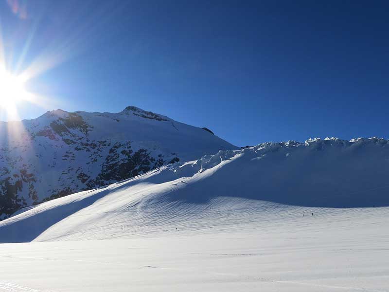 die strasse zum steigletscher wurde dieses jahr erst spät geräumt: in der höhe liegen immer noch unmengen an schnee. daher ist es nicht verwunderlich, dass hunderte von skitourengängern richtung sustenhorn und auch etliche zum gwächtenhorn unterwegs sind. will man den menschenmassen entfliehen, bietet sich die hübsche kletterei am westgrat an, wo man meistens alleine unterwegs ist, jedenfalls solange noch schnee liegt.