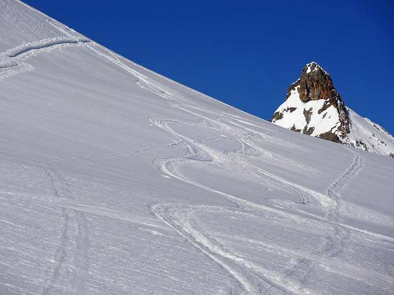 mit den skis entweder direkt vom gipfel durch die steile NE-flanke oder etwas gemütlicher: zunächst ~100hm gegen ESE abfahren und anschliessend durch die etwas weniger steile NNE-flanke. wir wählten die zweite variante, da wir hier die schneeverhältnisse als besser erachteten.