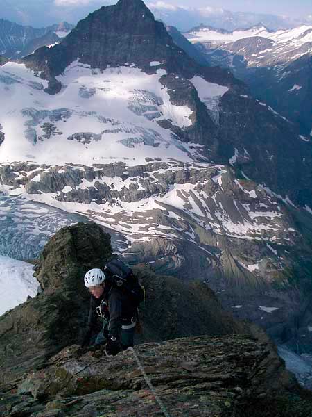 alles dem grat entlang, einzelne aufschwünge werden direkt erklettert. von einem turm muss kurz in eine scharte abgeseilt werden. zum schluss über den breiten firngrat zum gipfel. 2h