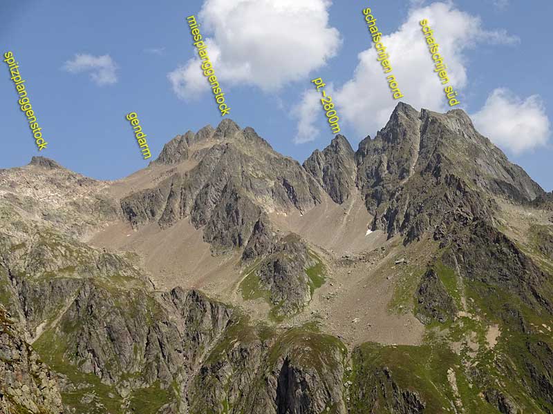 nicht kotierter pt.~2800m S-grat: vom sattel schräg links aufwärts bis an die schwach ausgeprägte rippe, welche man kurz verfolgt. sie drängt einem in die linksliegende rinne ab. durch diese bis auf den gipfel. der fels an diesem turm ist recht mürbe, daher sollten alle griffe und tritte vor dem verwenden gut überprüft werden. (T5, II, vom schafschijen bis hier 1h)
