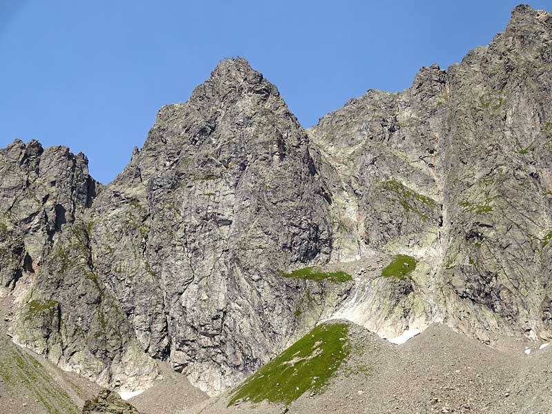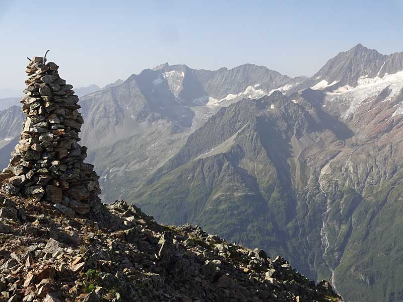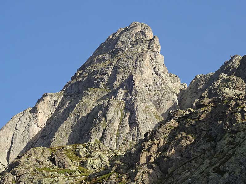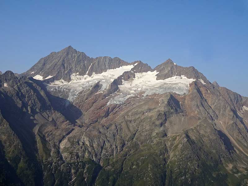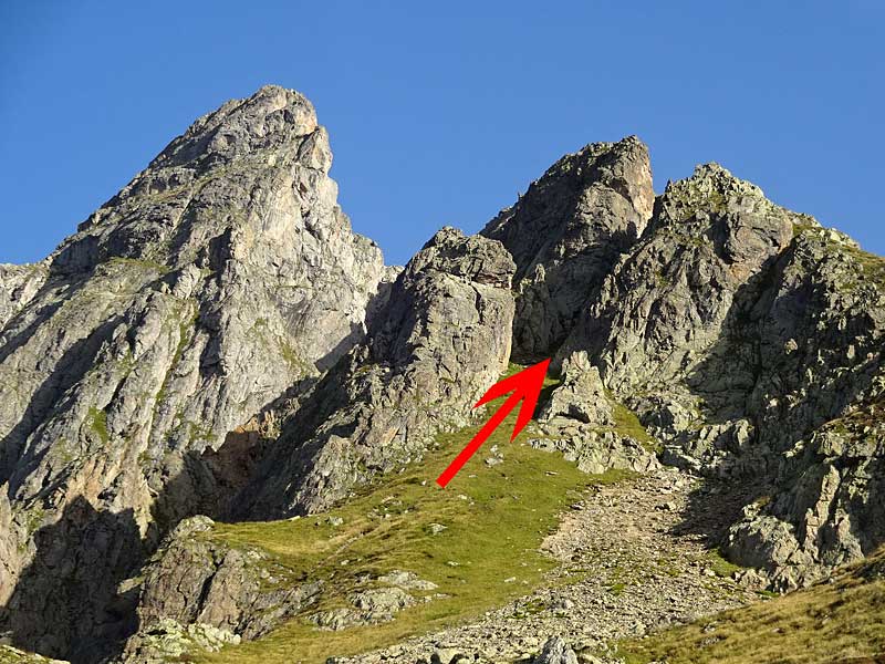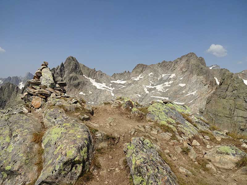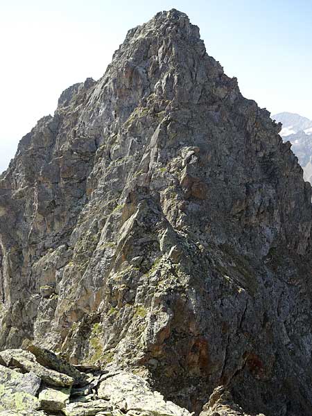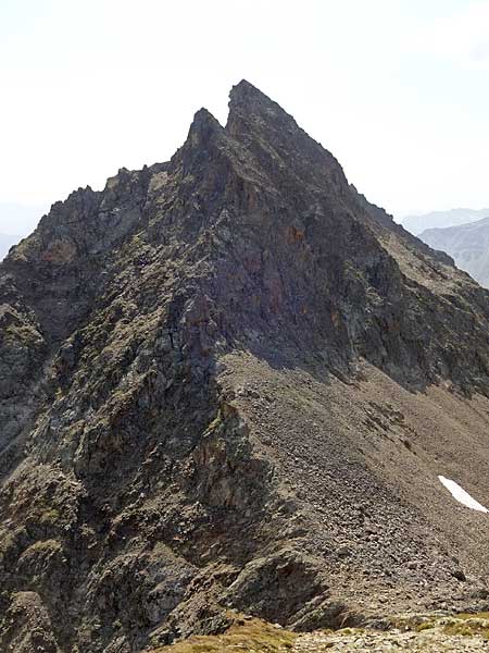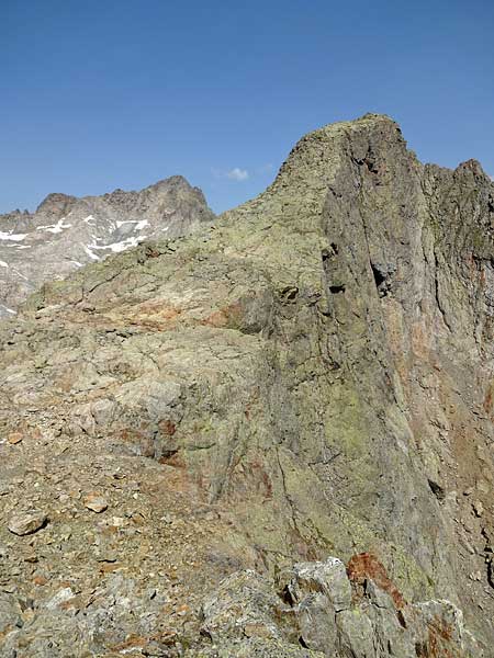 zunächst geht es über kurze, einfach felsen richtung der schrofen (hie und da schwache begehungsspuren durch gämsen). zunächst flach, dann immer steiler in eine erste verengung, wo man bei der gabelung die rechte rinne in die darüberliegende lücke wählt. von hier führt ein sehr exponiertes, aber einfach zu gehendes band (T4) kurz nach nordwesten. am ende dieses bandes nicht direkt die grasdurchsetzten felsen erklettern, sondern mit der hier ansetzenden unangenehm sandigen rinne nach links hinauf in den nächste lücke (T5). ein felsband führt wenige meter nach links auf eine kleine wiese. am ende dieser wiese wenig in die grosse rinne absteigen und durch diese bis auf einen nächsten sattel links der rinne aufsteigen. gleich links über eine schöne gneisstufe zu den nächsten schrofen hochklettern, wo oberhalb nach einer kurzen verengung der nächste sattel erreicht wird. zwei meter nach rechts und über schöne gneisfelsen zum grat zurück (vermutlich könnte man den grat auch auf anderen linien erreichen). nun den grat verfolgen, wobei zweimal eine kurze stufe abgeklettert wird. so steht man unvermittelt vor einer schuttflanke auf der ostflanke des berges. an deren linken rand steigt man zum kurzen ostgrat und erreicht so die lücke zwischen süd- und nordgipfel. in wenigen minuten zunächst nach süden zum grossen steinmann, dann nach norden zum zweiten gipfel. (T5, II, 1½h)
