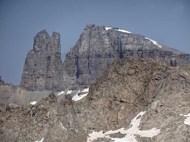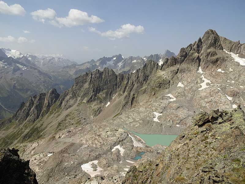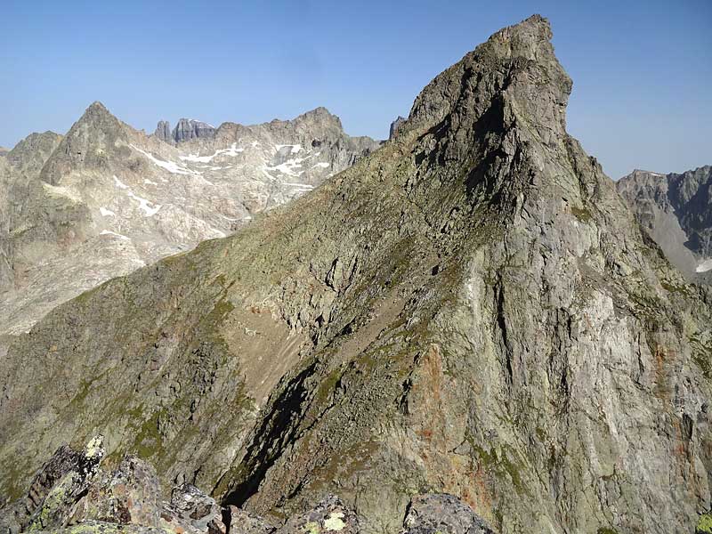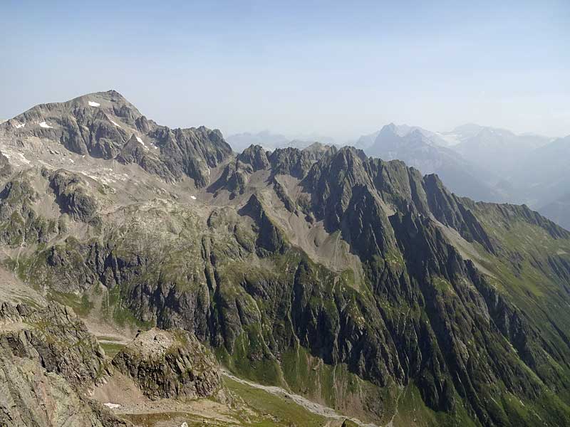 N-grat: dieser abstieg bereitete mir vorgängig etwas kopfzerbrechen, da er steil ist und sehr brüchig sein soll. ich befürchtete zustände wie beim nördlichen abstieg am murmelsplanggstock. doch zum glück erwiesen sich die felsen als recht stabil, jedenfalls solange man möglichst den grat verfolgt. nur um die beiden senkrechten stufen zu umgehen, bin ich auf rampensystemen ein wenig in die flanken ausgewichen (bei der oberen ost-, bei der unteren westseitig). so ereicht man den ersten kleinen turm im unteren bereich des nordgrates. gleich auf schartenhöhe auf einem band nach rechts, dann gleich zurück zum grat und diesen weiter verfolgen. den zweiten, markanten turm zunächst wenige meter links auf einer grasrampe umgehen, dann kurz zurück zum grat bis zur steilstufe. hier leitet ein kurzes kamin auf das ostseitig liegende rampensystem, mit dem man diese steilstufe umgehen kann. die letzte nadel umgeht man auf der linken seite. (T5, II)