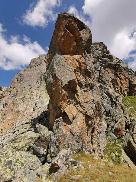 seewenhorn ostgrat: wunderschöner roter felsfinger im sattel neben dem westgratturm