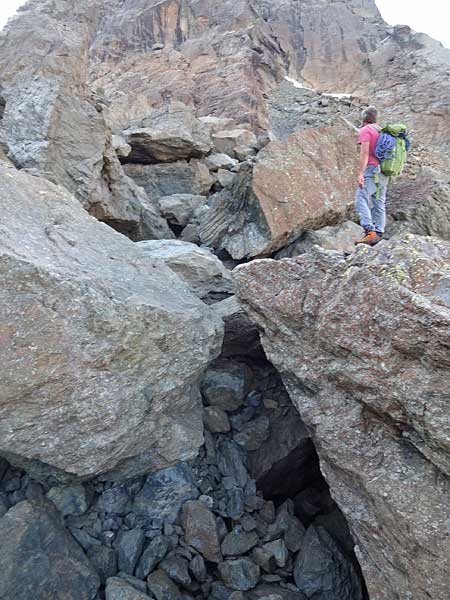 ein kurzer aufstieg zum passo della rossa (geisspfad, 2473m) bringt uns auf die italienische seite, wo man weiter den weg richtung alpe devero verfolgt. zunächst passiert man einen grösseren, dann einen kleineren see. gleich nach diesem zweiten see verfolgt man den richtung westen ansteigenden felsrücken (steinmann) und steigt weiter in geeigneter linie zunächst richtung westen, dann nach südosten über sehr grossblockiges bergsturzgelände an den wandfuss der NW-wand. (T4, 1½h ab geisspfadsee)