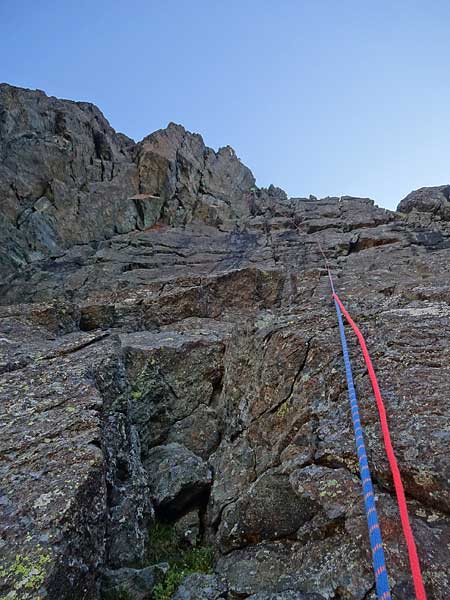 pizzo crampiolo sud westwand: wir wählten in der gipfelwand den rechten riss, original wäre wohl der linke