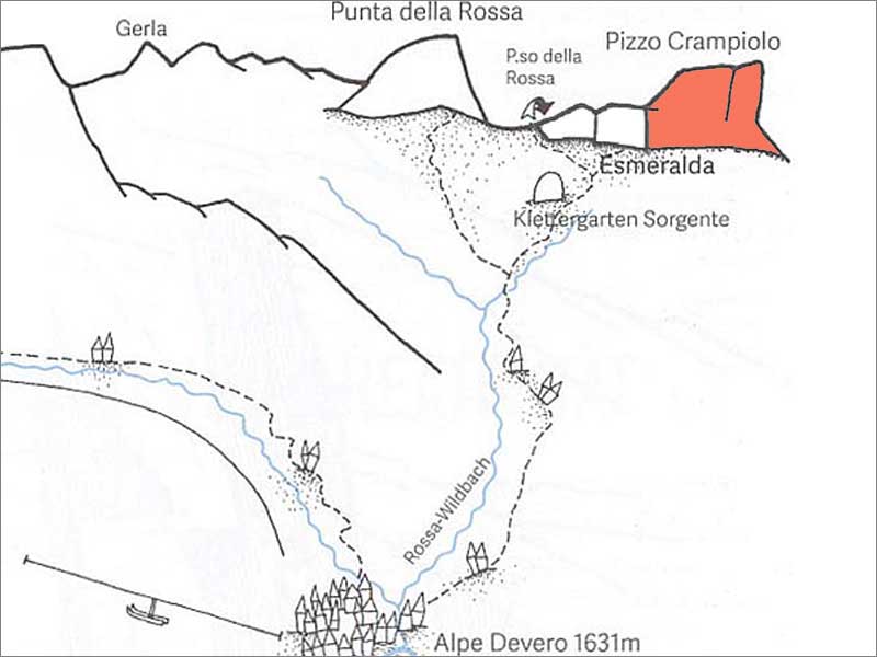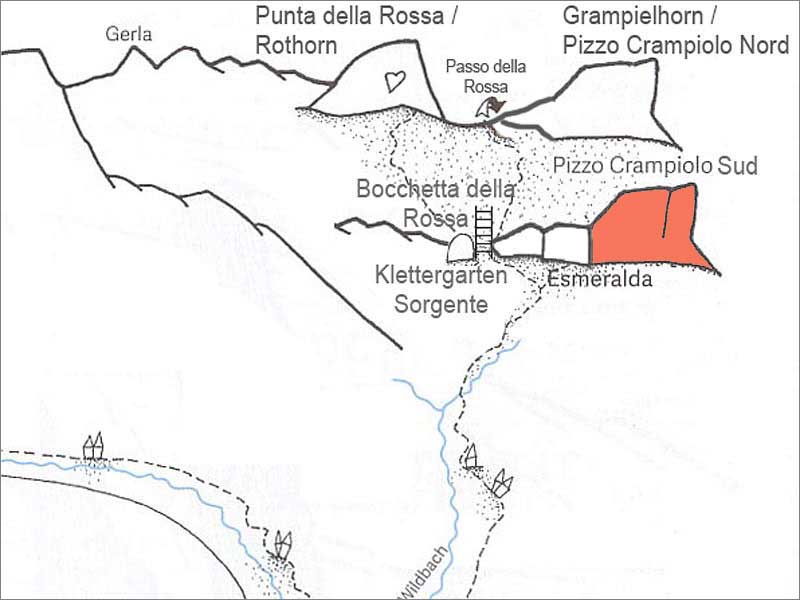 der zustieg allerdings ist im "versante sud" total falsch beschrieben. benutzt man diese hinweise, landet man an der nordwand des grampielhorns (pizzo crampiolo nord), von wo aus es unmöglich ist, an die klettereien des obigen gipfels zu gelangen. zudem schicken sie einem auf den passo di crampiolo (grampielpass, 2552m), aber benennen diesen als passo di valdeserta, welcher in beinahe 3km nordöstlicher luftdistanz liegt!