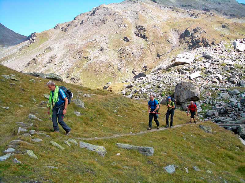 vom runden hotel "monte leone" (1991m) auf dem simplonpass geht's via bistine zur magelicke (2439m). über diese wechselt man ins wilde nanztal und erreicht vorerst auf einem alten säumerweg, nach pt.2483 auf schmalem pfad das obere fulmoos (2429m). nun geht's zunächst über verwachsene moränen, später auf geröll zum gamsagletscher und erreicht über ein letztes couloir die fletschhornhütte (3041m). WS, 3h