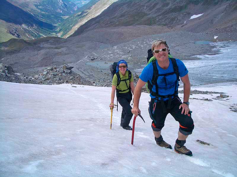 entweder weiter via fletschjoch (3694m) und N-grat auf's lagginhorn (4010m) oder auf der normalroute zurück über den grüebugletscher zur weissmieshütte. weiter nach kreuzboden, wo eine sesselbahn nach saas grund fährt.