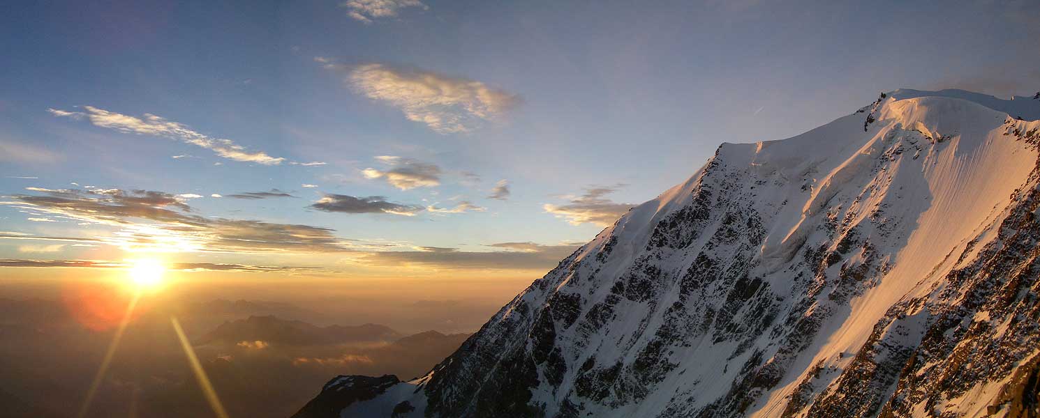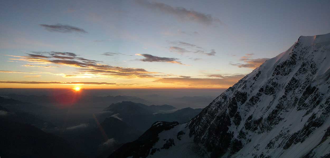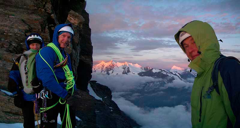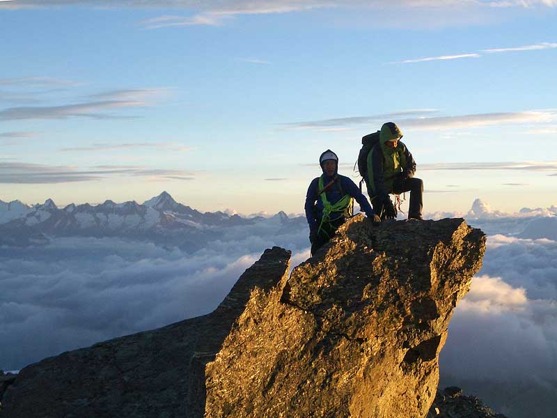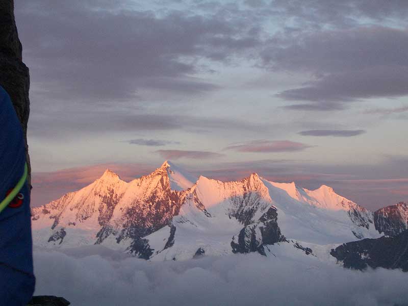 fletschhorn NNW-grat: die mischabelgruppe und das weisshorn sind bereits in der sonne