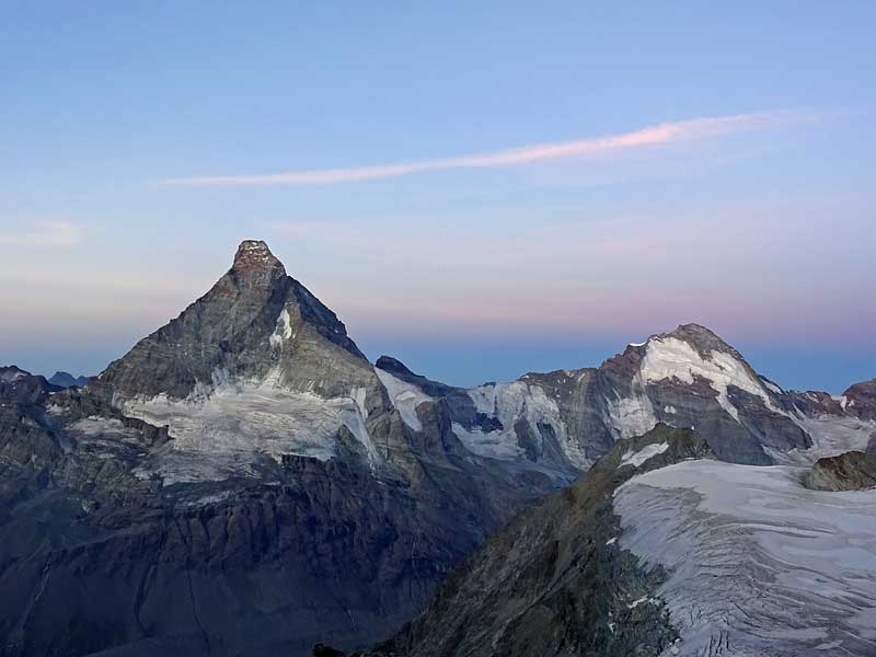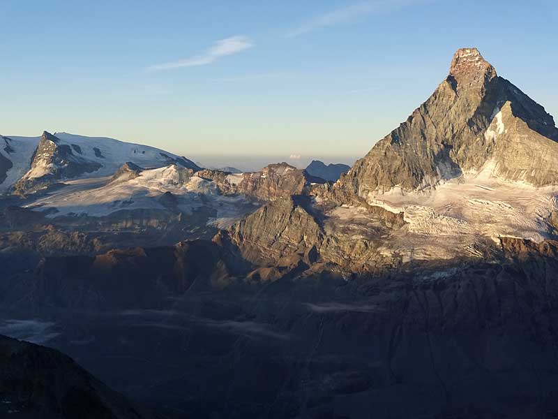 ober gabelhorn südwand: matterhorn und dent d'hérens im morgenlicht