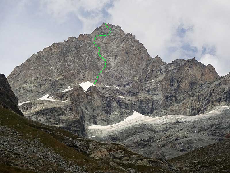 entlang von wegspuren (steinmänner) auf den abengletscher und auf dem schneefeld rechtshaltend unter die südwand. der einstieg befindet sich auf der rechten seite bei der markanten verschneidung. (WS, 1h)