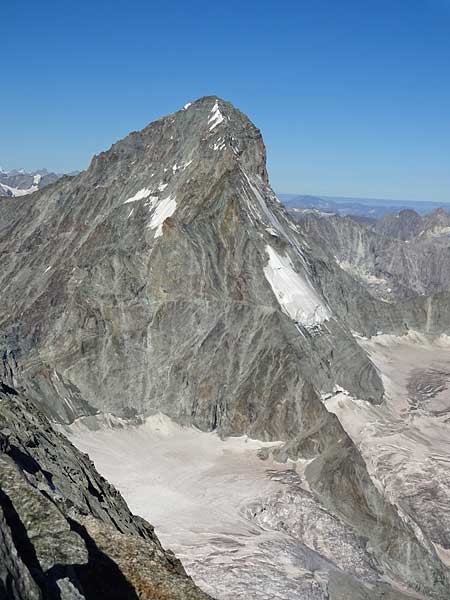 wie nach dem gabelgrat könnte man über den arbengrat absteigen, doch da wir am nächsten tag noch den kanzelgrat anhängen möchten, klettern wir entlang des ENE-grates ab, um so nach dem überschreiten des grand gendarme (3868m) und der wellenkuppe (3900m) via triftgletscher zur rothornhütte zu gelangen. (ZS, 3½h)