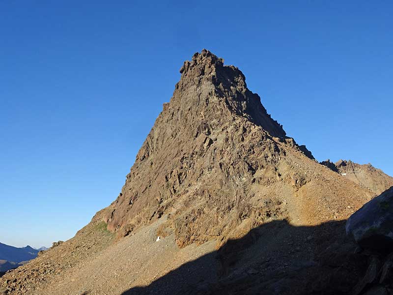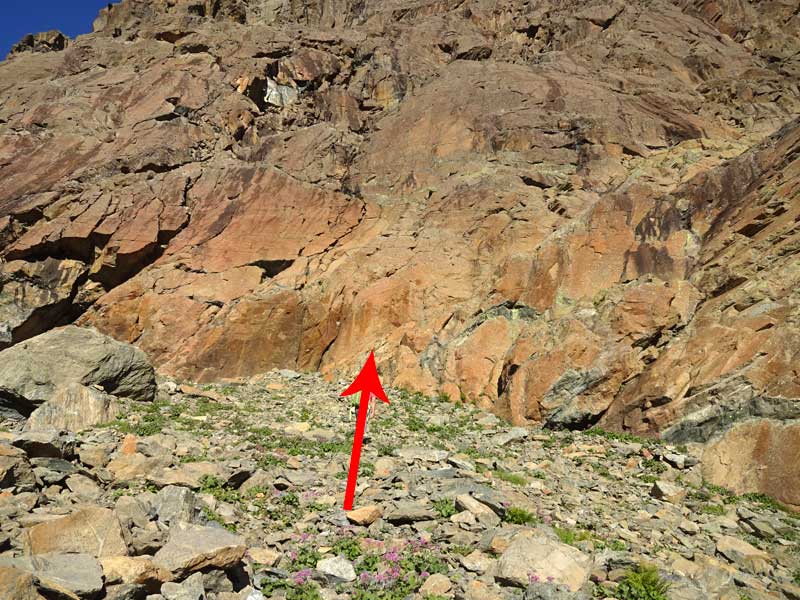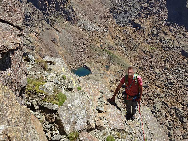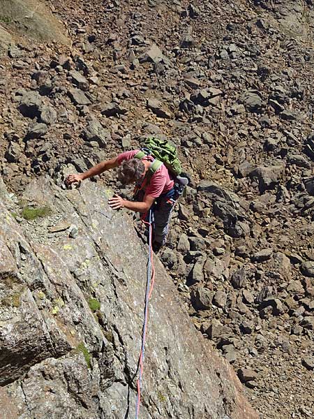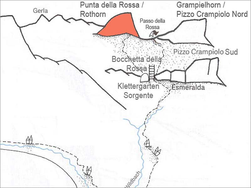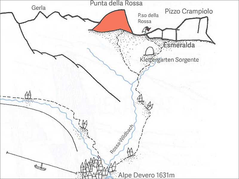 nun über den passo della rossa (geisspfad, 2473m) nach italien und beim ersten (kleinen) see vom wanderweg südwestlich richtung der eindrücklichen steilen ostwand abzweigen. über gut begehbare geröllhalden zum einstieg links des tiefsten punktes. (T3, ½h ab dem geisspfadsee)
