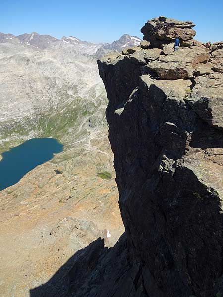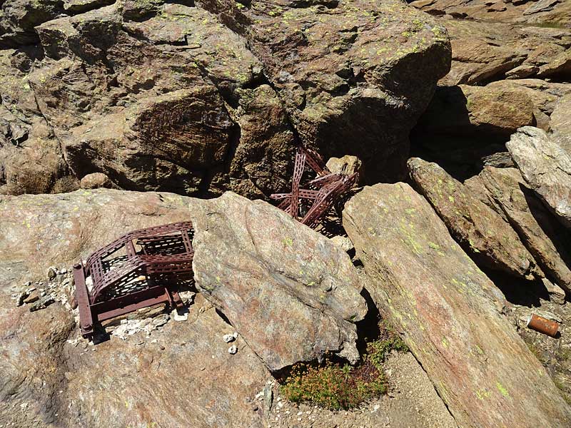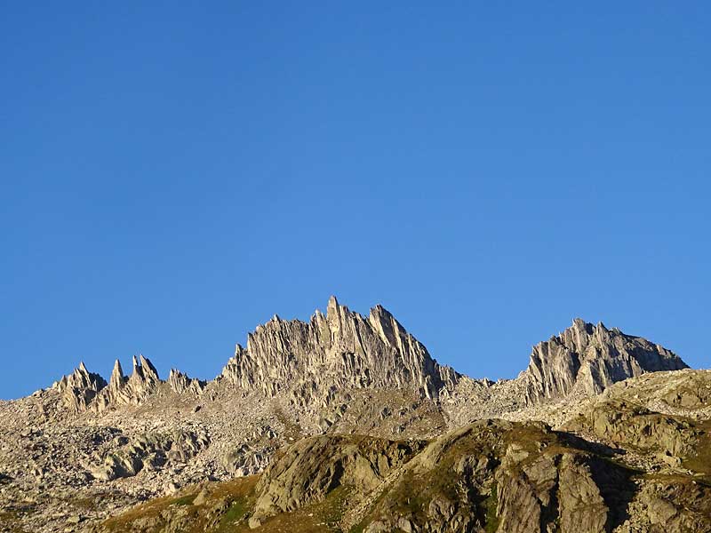 nach einem verregneten juli befürchten wir grossandrang in den bergen und suchen uns deshalb eine einsame gegend aus. wir werden in den kletterbergen oberhalb der alpe devero fündig: sie bestehen aus fantastisch rauhem, rotem serpentingestein. da wir aus der schweiz mit dem ÖV nur äusserst umständlich zur alpe devero gelangen könnten, reisen wir mit zug und postauto zuhinterst ins binntal (fäld), wo wir den landschaftlich sehr schönen aufstieg zum geisspfadsee (2423m) in angriff nehmen. hier deponieren wir unsere schlafsäcke. (T2, 2¼h ab fäld)