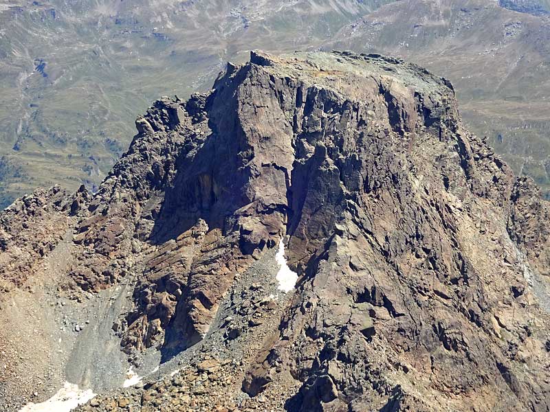 ursprünglich hatten wir die klassische ostwandroute geplant ("borsetti-provero-zani"), doch angesichts der komplexität dieser hohen wand und den äusserst schlechten topos auf dem versante-sud-führer entschieden wir uns, eine moderne route in angriff zu nehmen, wo wir uns für die wegfindung an den bohrhaken orientieren konnten. wir wählten die "nuovo millenio", weil sie in gerader linie beinahe zum gipfel führt und gemäss beschrieb immer den guten fels sucht. der einstieg ist angeschrieben (links des kleinen vorbaus), anschliessend ist es wirklich ein leichtes, die route nicht zu verfehlen. allerdings ist die linie hie und da sehr gesucht, im bemühen nur kompakten felsen zu klettern. schon der einstieg ist sehr fragwürdig: eine knallharte boulderstelle (nur mit 6a bewertet!) leitet auf die darüberliegende platte, während anderthalb meter links davon ein schöner riss einen viel logischeren zugang vermittelt. die zweite länge ist zwar wirklich wunderschön, doch die schlüsselstelle ist zwingend zu klettern. daher stimmt die bewertung im führer mit "6c oder 6a obligatorisch" definitiv nicht. im weiteren verlauf gibt es immer wieder stellen, wo anderthalb meter neben dem bohrhaken eine struktur einen logischeren und einfacheren weg ermöglichen würde. nach der sechsten länge fehlt im führer die verbindungslänge zur folgenden schlüssellänge - diese scheint einfach vergessen gegangen zu sein! ab hier wird die kletterei sehr steil, manchmal sogar leicht überhängend. die zehnte oder zweitletzte länge, die ebenfalls leicht ausladend ist, besteht nur aus ineinander verklemmten blöcken und ist damit etwas unangenehm zu klettern. nach der elften länge führen wenig schwierige felsen auf den sattel, wo man die ersten zwei kreuze entdeckt. dahinter befindet sich ein grosses flaches (!) feld, an dessen nordostende ein drittes kreuz am boden liegt.