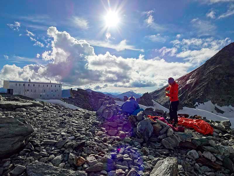 normalerweise von zinal (1675m) via combautanna (2578m) auf gut ausgebautem weg in die cabane de tracuit (3256m). da wir jedoch den tête de milon über die crête de milon bestiegen haben, bleiben wir gleich beim abstieg vom gipfel auf dem col de tracuit. die hütte meldete schon tage zuvor "complète", daher legen wir uns auf einen der schönen biwakplätze.