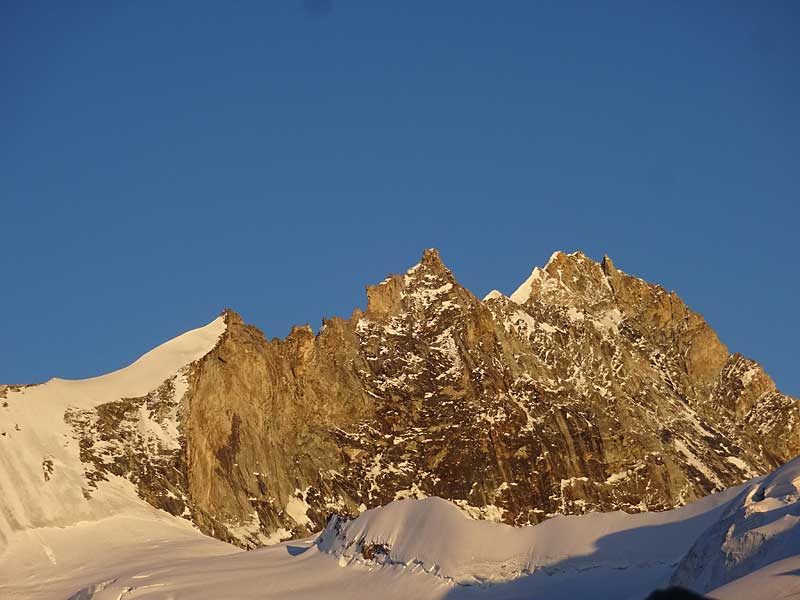 hervorragende verhältnisse - zwar muss sowohl am nord- wie am ostgrat durchgehend mit steigeisen geklettert werden, da von der vergangenen kaltfront doch noch einiges an schnee liegt. dafür sind die firnpartien in perfektem zustand. auch ist der steile eiswulst im abstieg über den ostgrat dieses jahr nicht vorhanden