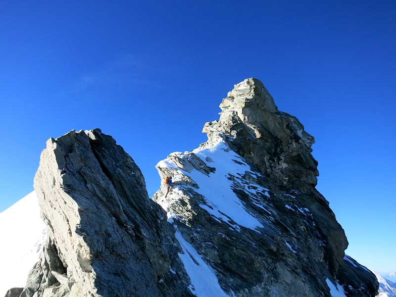 erst hier beginnt die wunderbare tour, eine der schönsten "himmelsleitern" der schweiz: einfacher abstieg zum weisshornjoch (4058m) und aufstieg über firn und einfache felsen zu pt.4203. nun wird es anspruchsvoller, aber auch interessanter: eine erste abseilstelle von circa 20m leitet zum weiterweg, bald kommt eine zweite abseilstelle von etwa 15m (eine weiterer inox-haken befindet sich gleich hinter der kante). alles entlang des grates (nur ein kleiner turm wird östlich umgangen) bis zu einer platte, die links ansteigend erklettert wird. an der basis des grand gendarme (4329m) angekommen erreicht man die schlüsselstelle: zunächst etwas links zu einem bohrhaken, dann steil aufwärts in zwei nicht allzulangen seillängen auf die kleine schulter nordseitig des grand gendarmen (4331m). zunächst wieder luftig gegen den gendarmen zu, den man nun auf einem einfachen band ostseitig umgeht. kurzer abstieg zum sattel und anschliessend auf dem fantastischen firngrat zum gipfel des weisshorns. 7½h