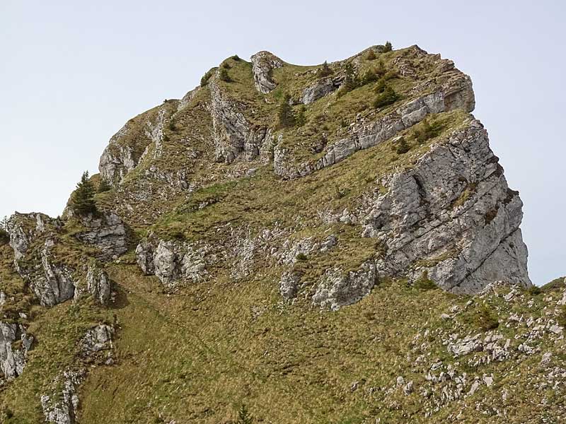 grönflue überschreitung SW-NE: die steile NW-wand der baumgarteflue mit dem wohl schönsten felsen der ganzen kette