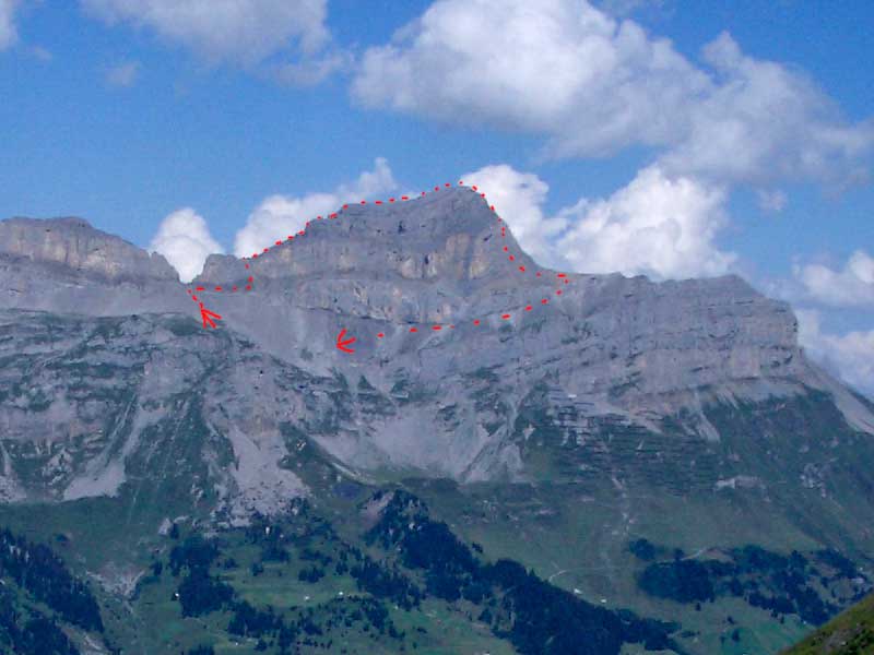 zunächst in der rinne hoch zum grat (II bis III), dann alles entlang dem nordwestgrat zum gipfel. meistens gehgelände, einige wenige kletterstellen (III bis IV), allzu üppig mit bohrhaken abgesichert. 1½h